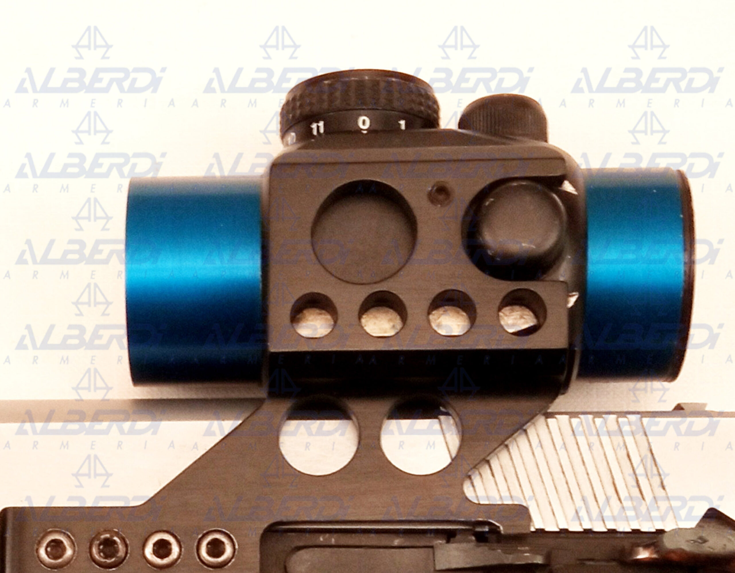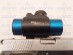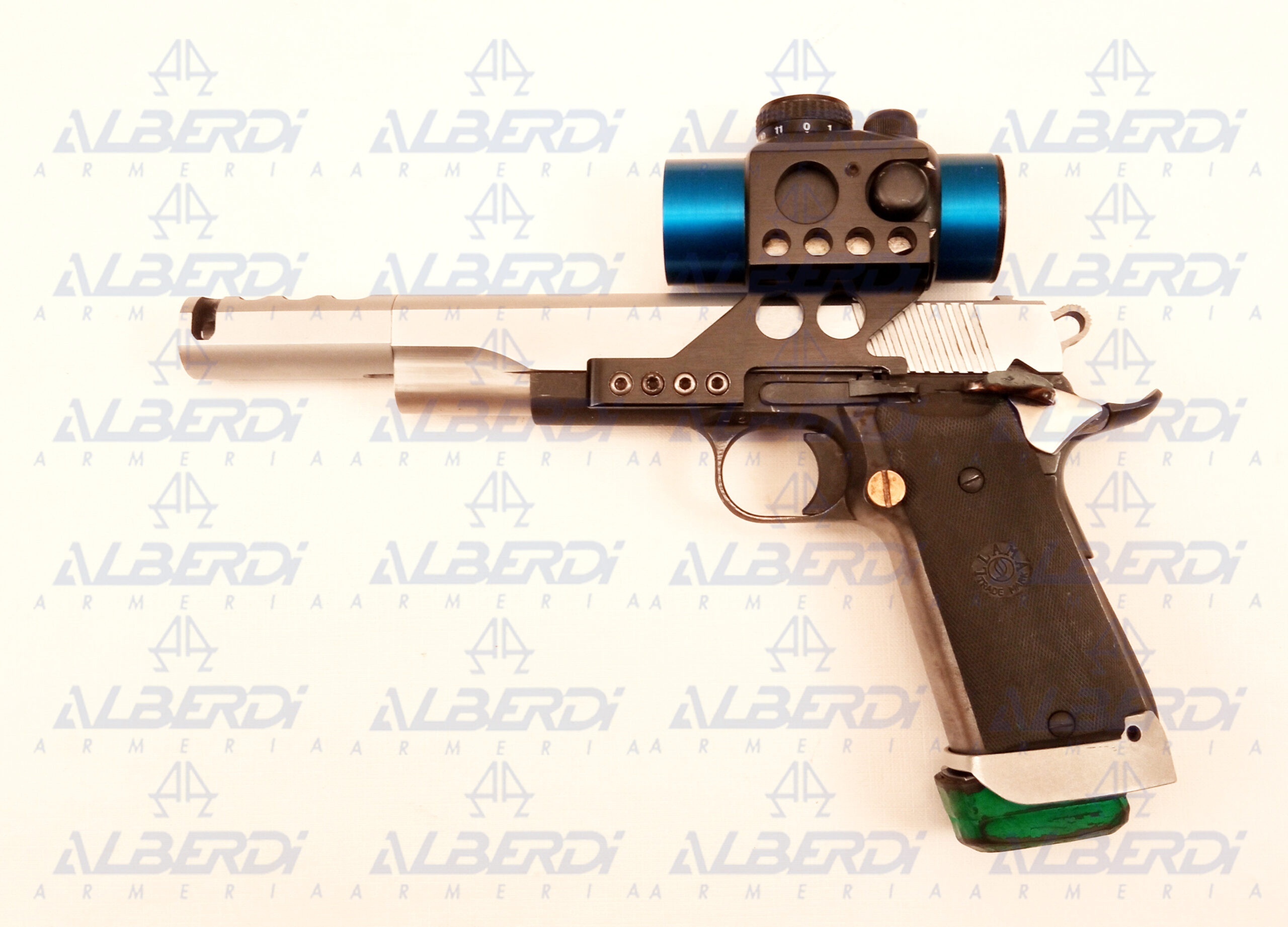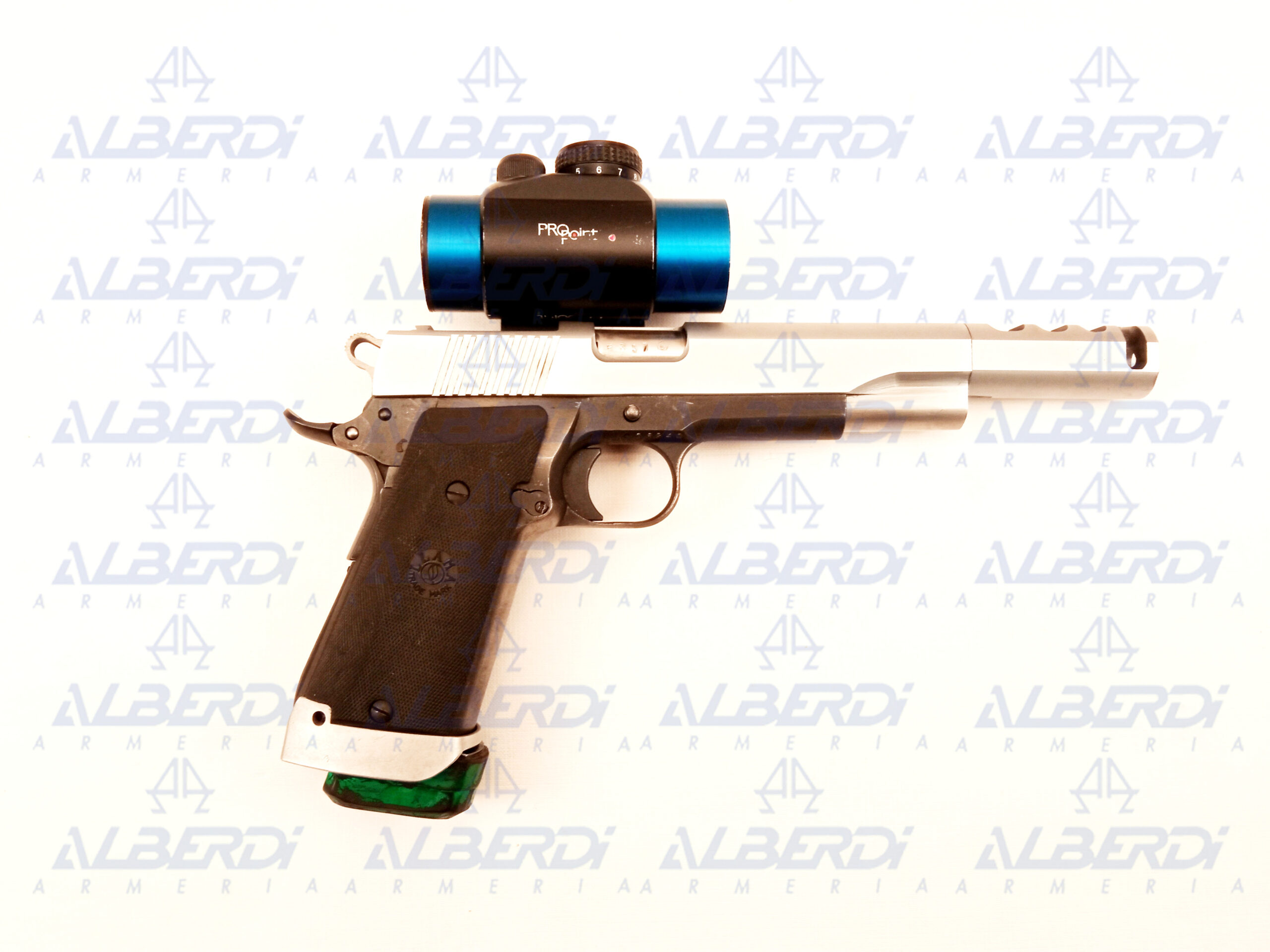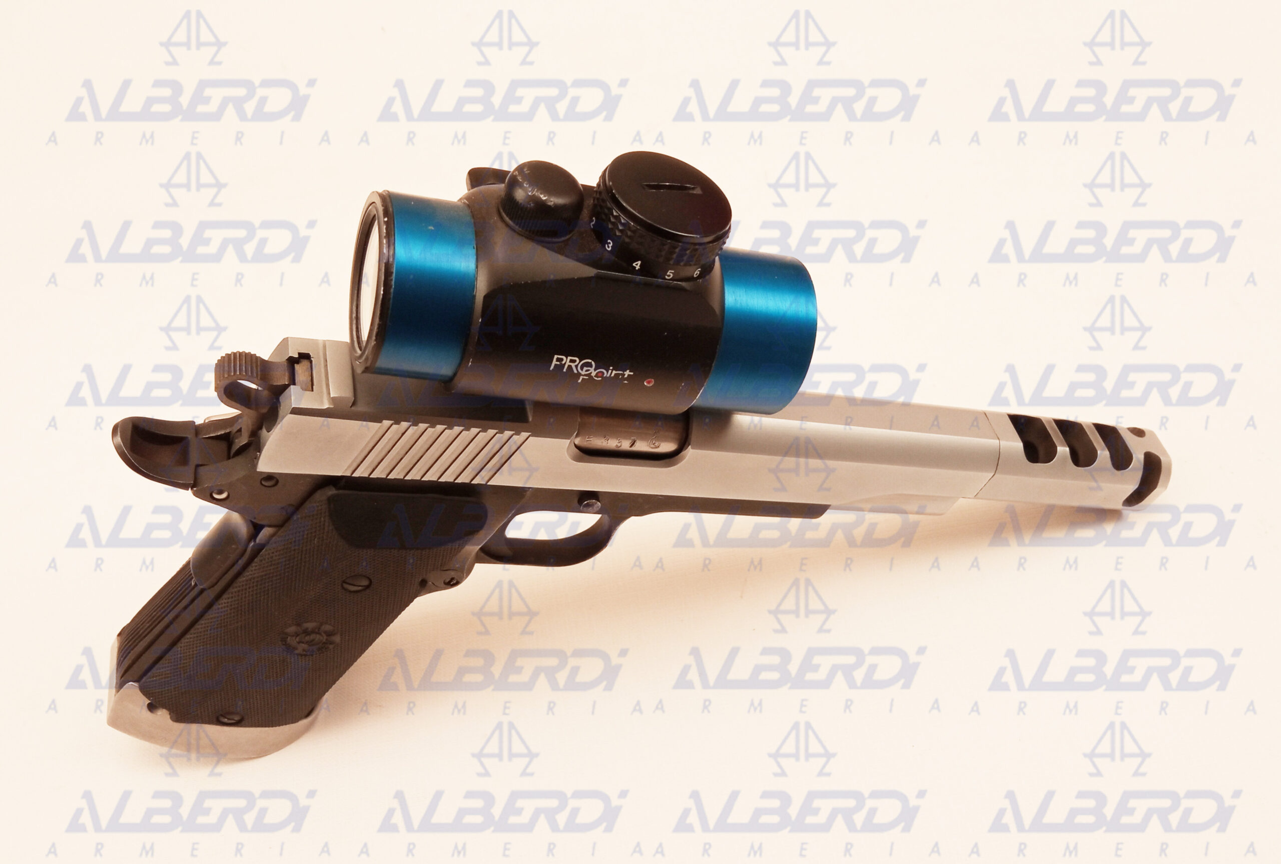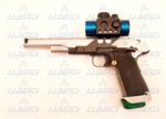Pistola semiautomática preparada para tirar recorridos, con gatillo a la vista de simple acción, seguro de empuñadura desactivado, freno de boca, punto rojo PRO POINT , cachas de goma, seguro en la corredera sobredimensionado, capacidad del cargador 15 cartuchos.