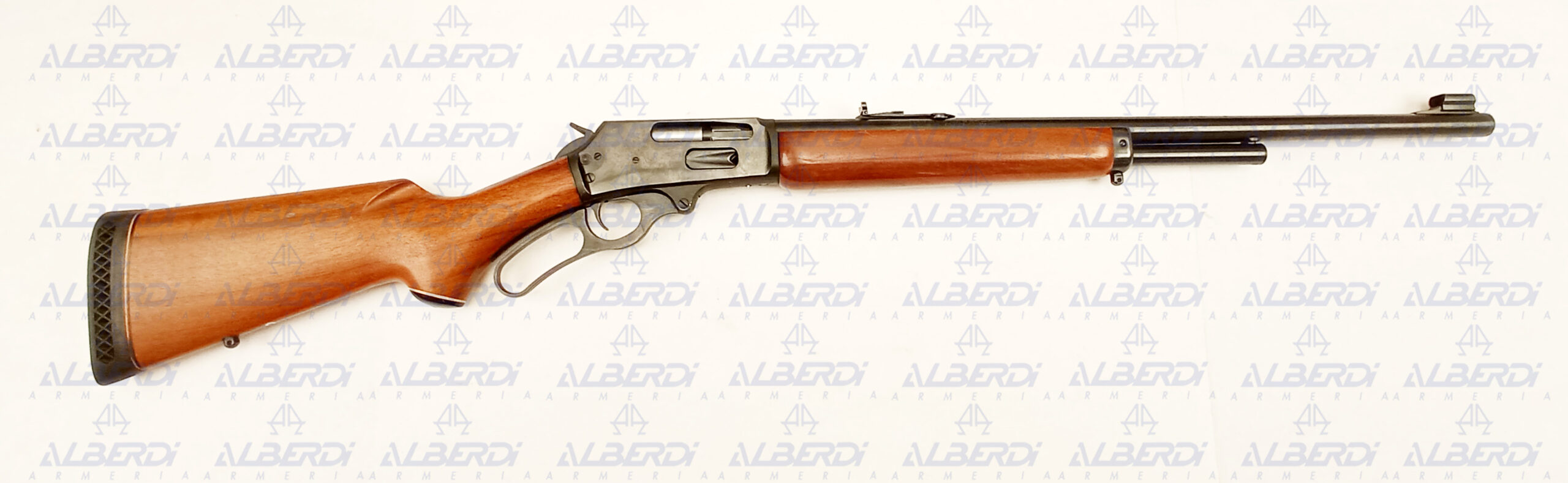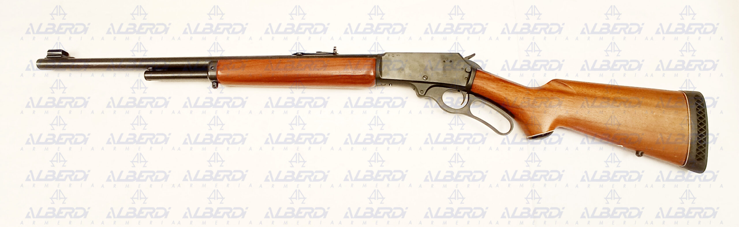 Rifle de repetición accionado por palanca, capacidad del cargador 5 + 1 cartuchos, alza abatible regulable en altura y punto de mira tipo bola. Seguro de pasador en en armazón.