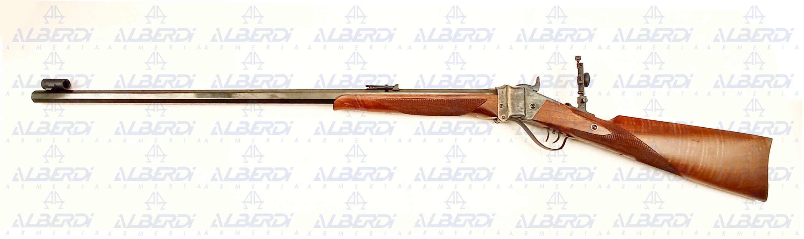 Rifle con cierre SHARPS para tiro a larga distancia, con alza con deslizante, punto de mira de tunel con inserto intercambiables y diopter.